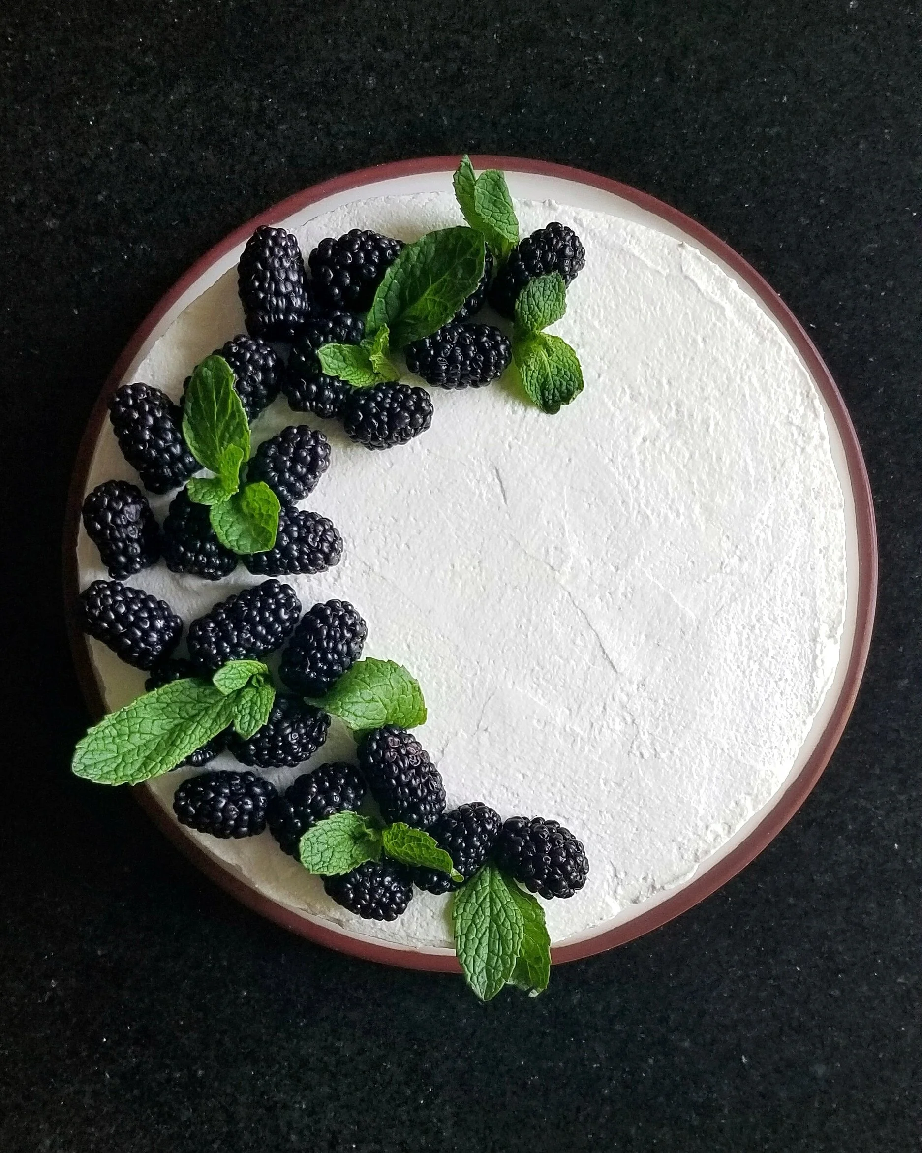 Decorate your frosted cake with some fresh berries such as blackberries or blueberries and fresh mint leaves for a refreshing summer look.
